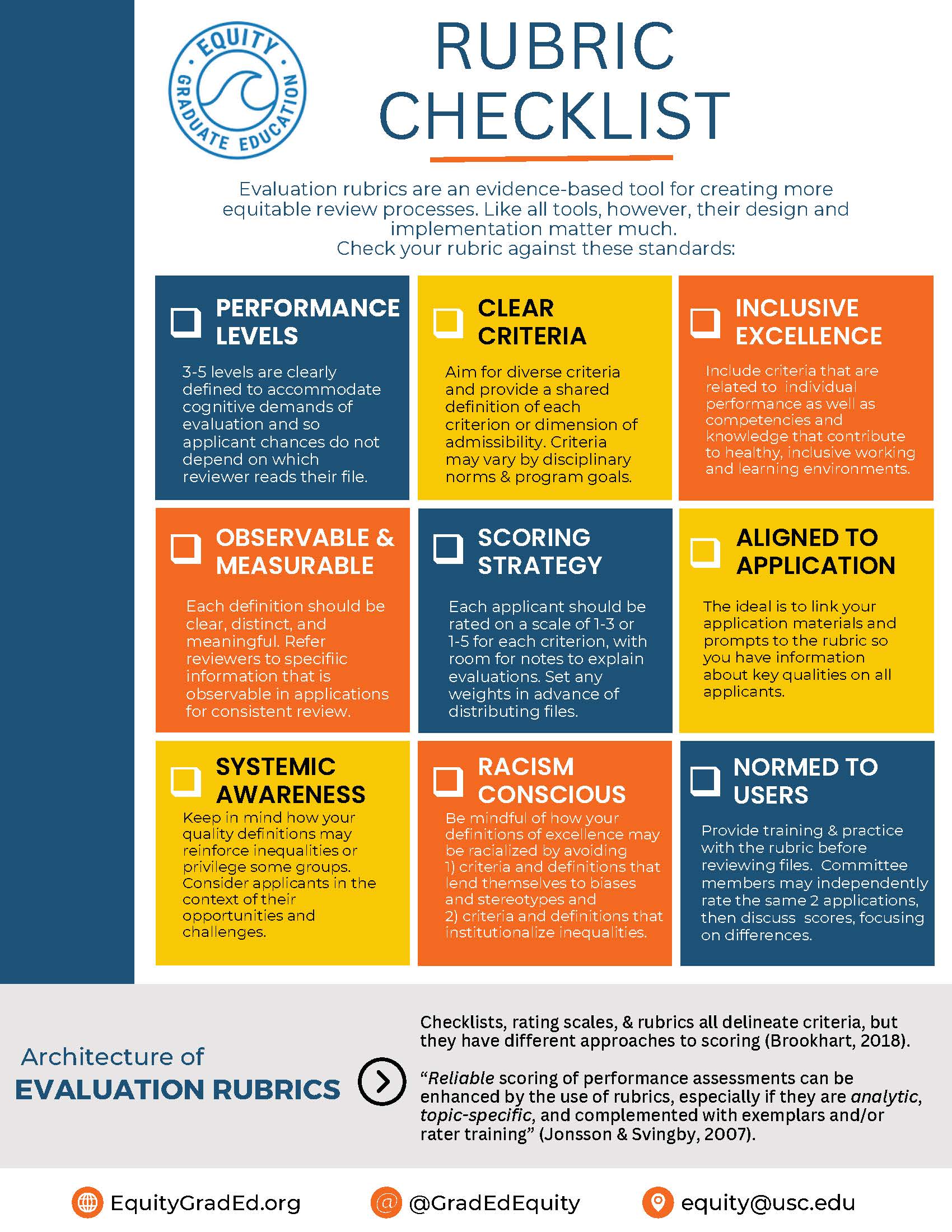 The use of evaluation rubrics can help to create more equitable admissions processes. However, it can be difficult to know how to design and implement them to be effective tools. This research-based guide was designed for departments and programs who are adopting evaluation rubrics in their admissions processes to self-assess their rubrics against common standards.